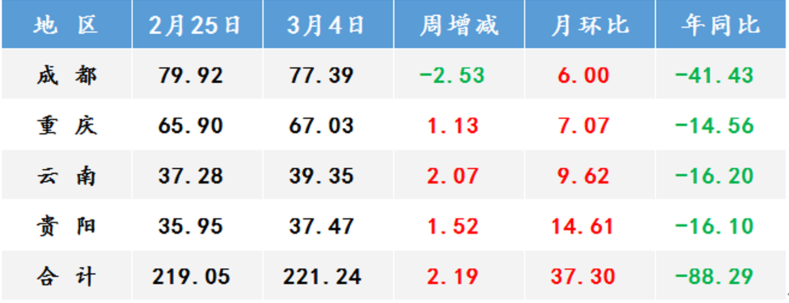 本周西南地区螺纹钢现货价格大幅上涨,终端需求逐步释放,商家投机划库气氛活跃,整体成交氛围持续改善。资源方面,西南区域内电炉钢厂已陆续复产,但受制于废钢资源紧张价格坚挺以及部分钢厂技改尚未投产等影响,整体产量增加有限。近期钢厂出厂价格坚挺,商家受补库成本较高等影响,多消化自有库存,本周成都地区社会库存降幅扩大,其余市场继续增库。